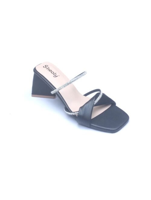 Sheoly Black Rhinestone Strap Triangle Heel Mules